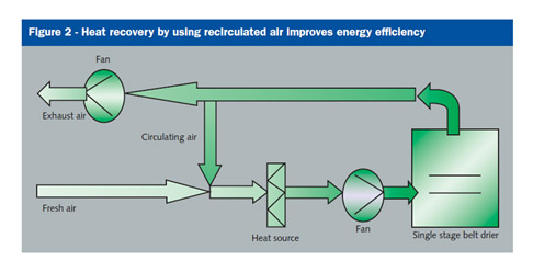 One of the belt drying system’s particular features is the improved energy efficiency afforded by recovering heat using an air-recirculation system.