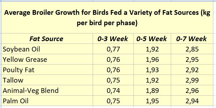 Table 1 – Average broiler growth for birds fed a variety of fat sources
