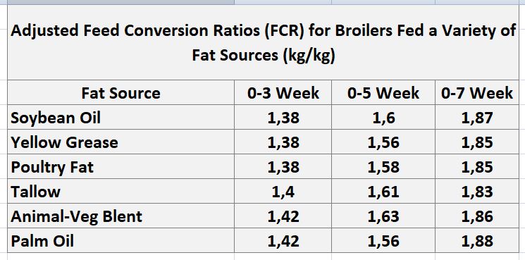 Studies in poultry rations have shown that unsaturated vegetable oils have a higher ME value than rendered fats or products with high free fatty acid content. However, no difference was observed in the performance parameters of the different fat sources when fed as a portion of a complete ration (Table 1-2).
