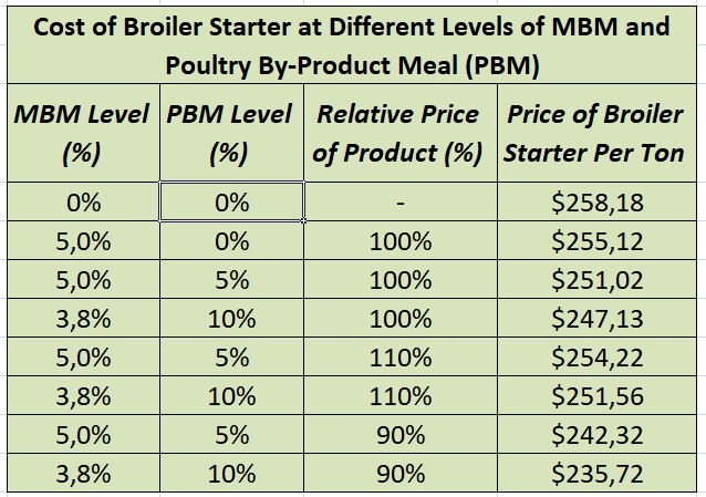 Table 3 – Cost of broiler starter at different levels of MBM and PBM (Poultry By-Product)