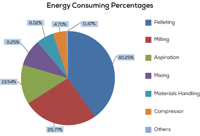 Energy is one of the most critical input resources in the manufacturing industries. In most cases, energy cost outweighs the costs of other resources such as raw material, labors, depreciation and maintenance. The key point of energy cost is changeable and has effect on feed cost. The aim of the animal feed production is to mix, as homogenous as possible, various raw materials and components to provide a balanced nutrition to food producing animals with the best conversion performance. As basic principle we cannot change whole system but touches of components are clear. Actually energy is not only from electrical sources, steam and compressed air is also energy sources and consuming points.