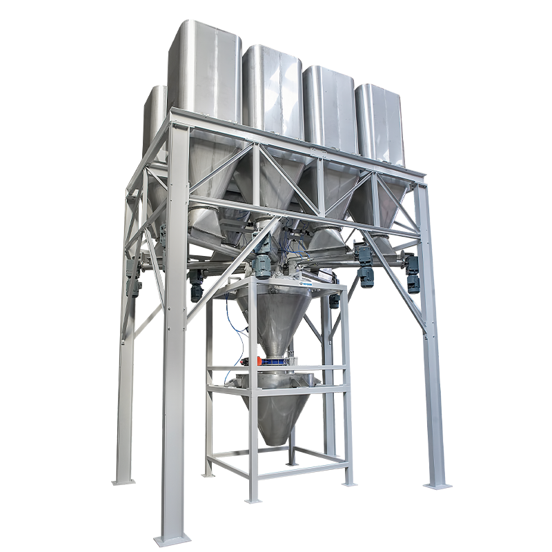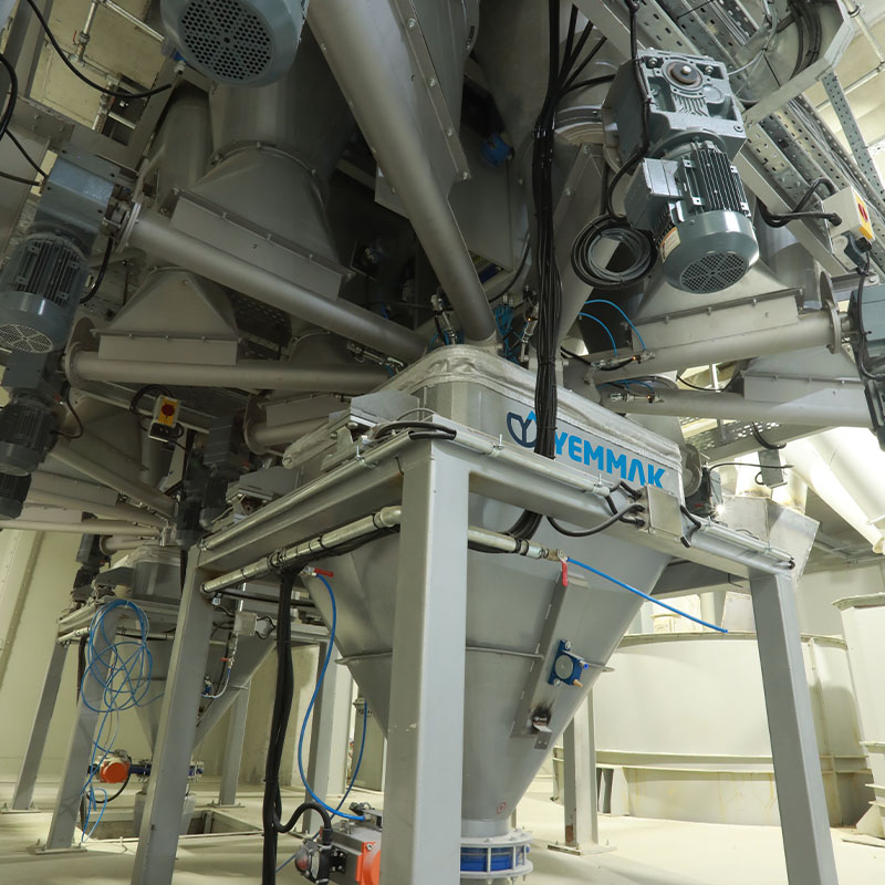 The screw conveyors used for dosing have a diameter of 100 mm. There is a pneumatic valve at the outlet to prevent spills. The screw conveyors and the dosing scale have a flexible structure. The product is weighed by the precise weighing system of the dosing scale and then it is transported to the mixer with the help of pneumatic butterfly valves. Micro components are stored in bunkers made of stainless steel and suitable for food storage.
