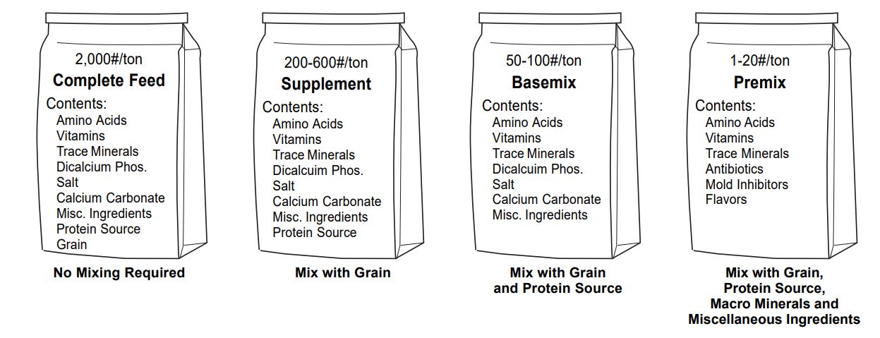 Premixing of micro-ingredients in a suitable atmosphere is a common method used to ensure that these nutrients are evenly distributed in the final feed. This mixing must be done accurately and carefully under a strict quality control program. Vitamins, micro-minerals, antibiotics, mold inhibitors and flavorings are mainly added to feeds in the form of premixes. Addition rates ranging from 0,5 to 10 kg per ton of compound feed are common. These ratios depend on the mixing equipment and the type of feed produced. In Figure 1, a definition is made through the relationship between the concept of premix and other feed ingredients.