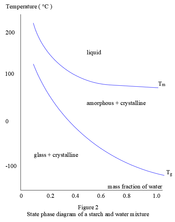 The relation between the three states, temperature and moisture content can be seen in a state phase diagram such as Figure 2. In this figure two curves are visible: The lower curve is the glass transition curve (Tg), the second curve is the melt transition curve (Tm).