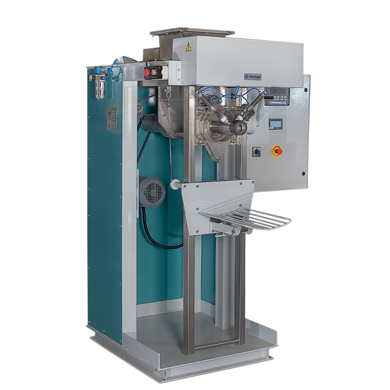 A valve bag filling machine with a single or multiple filling mouths is used according to the capacity. The product to be bagged becomes homogeneous thanks to the replaceable, wear-resistant rotor blades. The tray can be adjusted according to the bag height. After the system is started, fast and slow fillings are made. There is an electronic safety button for emergencies.