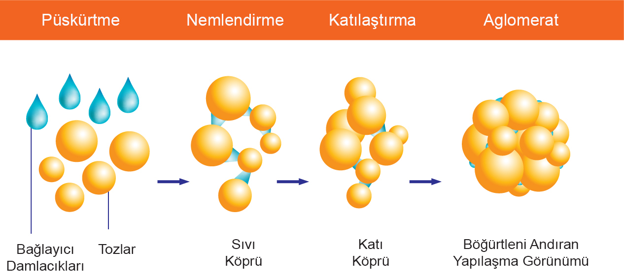 - Şartlandırma: Tozları bir bağlayıcı ile karıştırarak tozu azaltma, taşımayı kolaylaştırma, kullanışlılığı artırma amaçlı tercih edilen aglomerasyon yöntemdir.