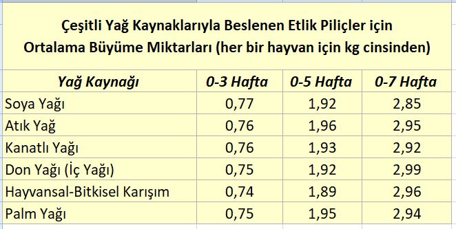 Tablo 1 – Çeşitli yağ kaynaklarıyla beslenen etlik piliçlerde ortalama büyüme miktarları
