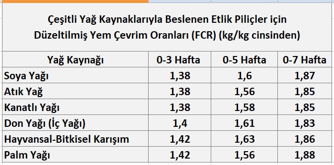 Tablo 2 – Çeşitli yağ kaynaklarıyla beslenen etlik piliçlerde yem çevrim oranları