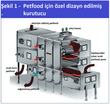 Bantlı kurutucuların kullanımı, balık, et ve tahıl ham maddelerinden yapılan kuru ekstrüde ürünlerin yaygın olarak üretildiği evcil hayvan mama endüstrisi için çok sık kullanılan bir yöntemdir. Ön ekstrüzyon karıştırma işlemi sırasında (ham maddenin şartlandırılması sırasında) eklenen suyun, istenen kıvamı elde etmek ve raf ömrünü uzatmak için nihai üründen uzaklaştırılması gerekir.