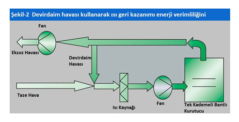 Bantlı kurutma sisteminin temel özelliklerinden biri, bir hava devirdaim sistemi kullanarak ısının geri kazanılmasıyla sağlanan iyileştirilmiş enerji verimliliğidir. Ilık havayı temiz hava ile karıştırıp bu karışımı ısıtmak, soğuk-temiz havayı ısıtmaya kıyasla daha az enerji harcanması anlamına gelir.
