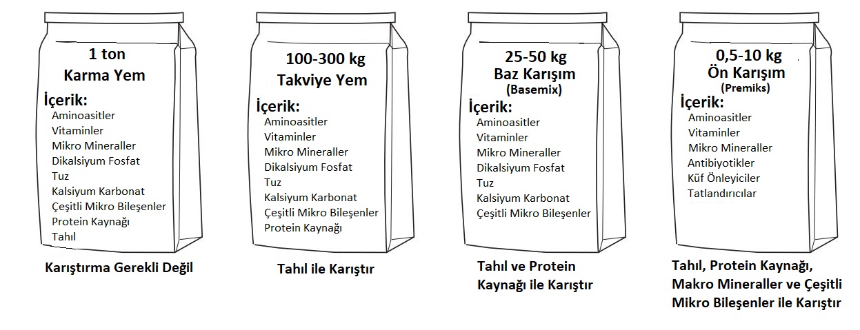 Mikro besinlerin/bileşenlerin uygun bir ortamda önceden karıştırılması, bu besinlerin nihai yemde düzgün şekilde dağılmasını sağlamak için kullanılan yaygın bir yöntemdir. Bu karıştırma, sıkı bir kalite kontrol programı altında doğru ve dikkatli bir şekilde yapılmalıdır. Vitaminler, mikro mineraller, antibiyotikler, küf önleyiciler ve tatlandırıcılar ağırlıklı olarak yemlere premiks şeklinde eklenir. Bir ton karma yem için 0,5 ila 10 kg arasında değişen ekleme oranları yaygındır. Bu oranlar, mevcut karıştırma ekipmanı ve üretilen yemin türüne bağlıdır.Şekil 1’de premiks kavramının diğer yem bileşenleriyle ilişkisi üzerinden bir tanımlama yapılmıştır.